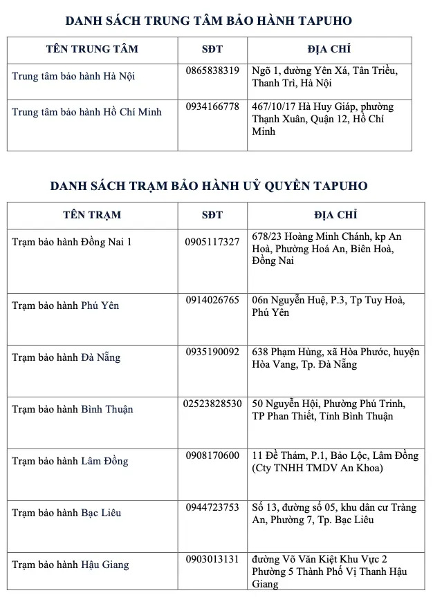 Bên cạnh đó, TAPUHO áp dụng chính sách bảo hành toàn quốc, thông qua hệ thống phân phối và các trung tâm bảo hành chính hãng, giúp khách hàng dễ dàng tiếp cận dịch vụ ở bất kỳ đâu.