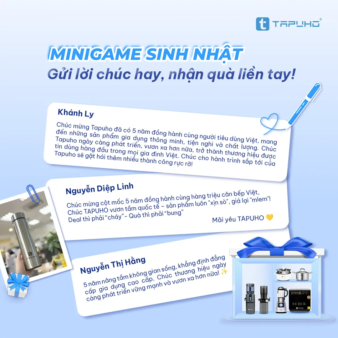 Năm 2025 đánh dấu một cột mốc đặc biệt của Tapuho – tròn 5 năm hiện diện và đồng hành cùng hàng triệu gian bếp Việt. Từ những ngày đầu đặt những viên gạch đầu tiên cho hành trình “nâng tầm trải nghiệm nấu nướng”, Tapuho đã không ngừng đổi mới, sáng tạo và lan tỏa giá trị sống hiện đại, tiện nghi nhưng vẫn gần gũi, gắn kết tình cảm gia đình.