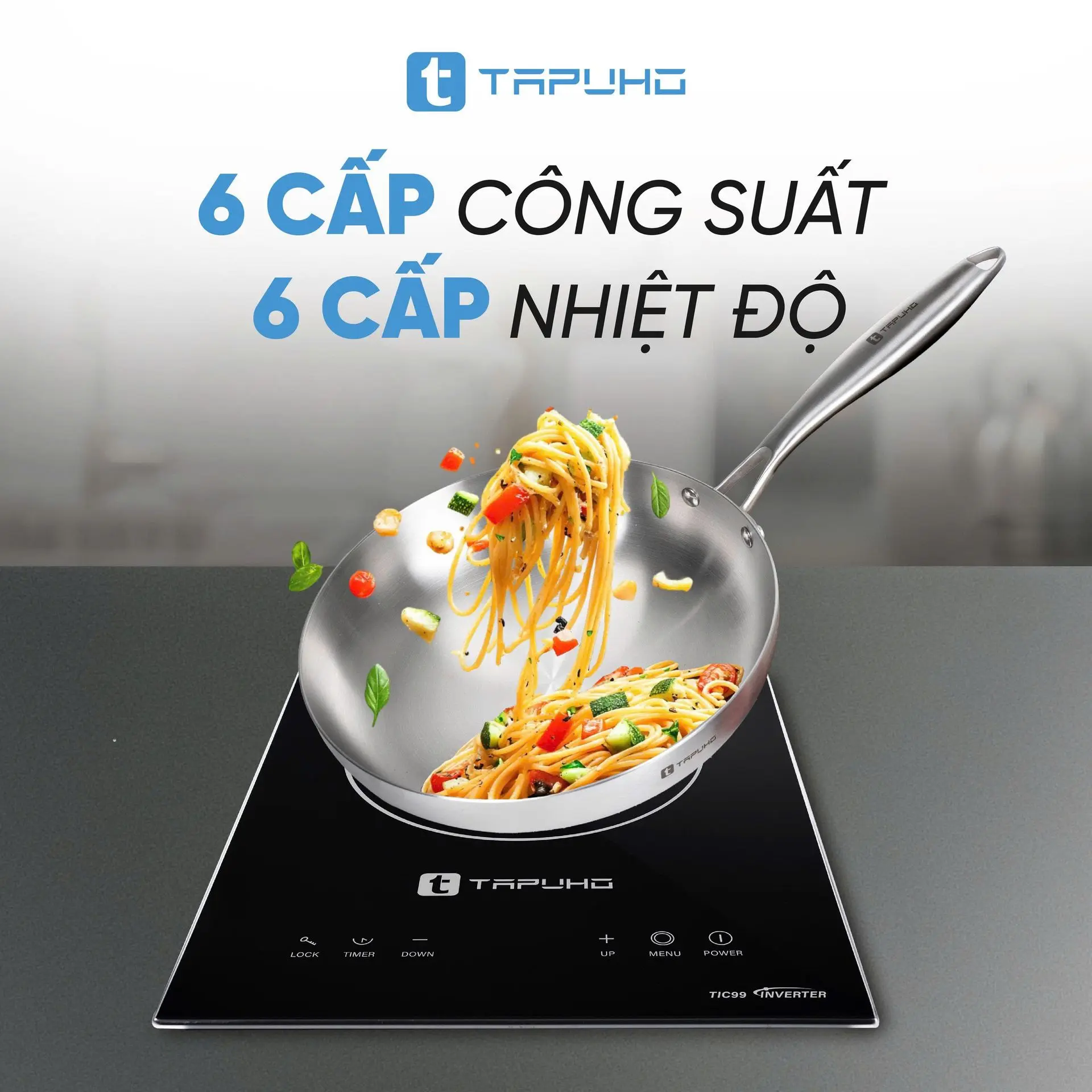 TIC99 cung cấp 6 mức công suất từ 200W đến 2200W và 6 mức nhiệt từ 60°C đến 240°C, cho phép bạn lựa chọn chế độ nấu phù hợp từng món ăn: