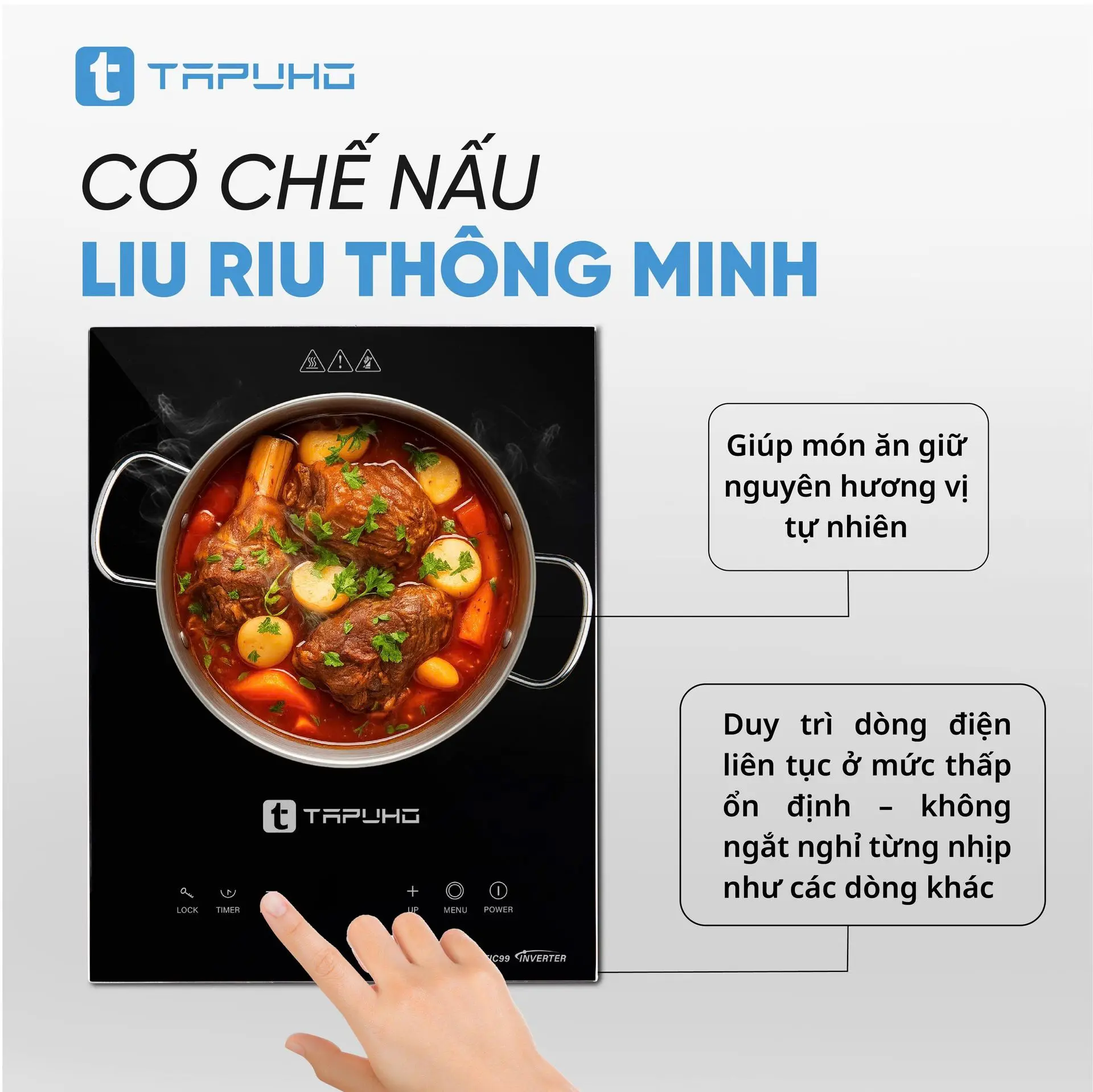 Còn với TAPUHO TIC99, chế độ “liu riu thực thụ” duy trì công suất thấp ổn định – nấu món gì cũng mềm tơi, tròn vị, không cần canh chừng.