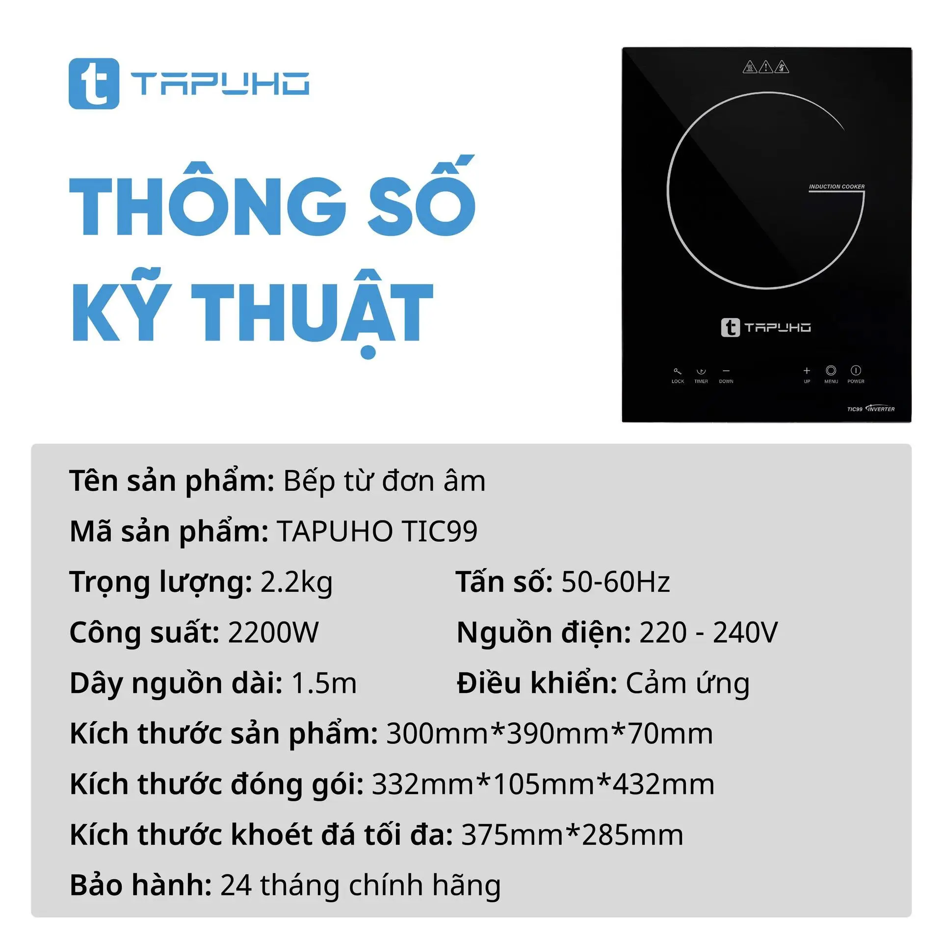Nhìn chung, Bếp từ đơn âm TAPUHO TIC99 không chỉ là một thiết bị nấu ăn – nó là trợ thủ thông minh, an toàn và tiết kiệm giúp bạn nấu ngon hơn, sống tiện hơn và an tâm hơn mỗi ngày. Với thiết kế gọn gàng, tính năng đầy đủ, độ bền cao và giá thành hợp lý, TIC99 xứng đáng là lựa chọn đáng tin cậy cho mọi căn bếp hiện đại.