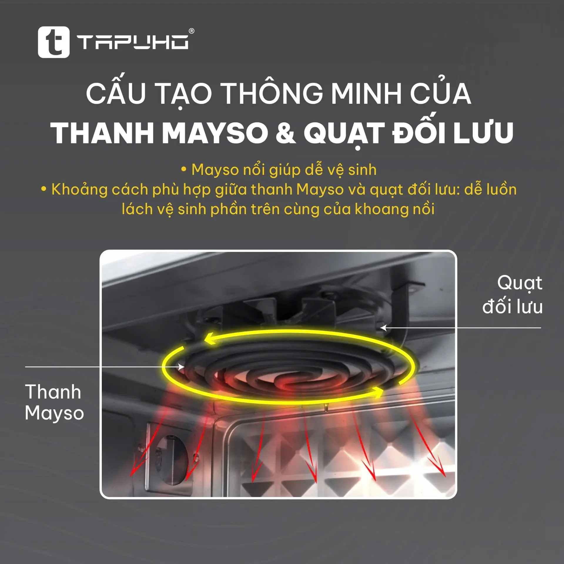 Đặc biệt, khoảng cách hợp lý giữa thanh mayso và quạt đối lưu được TAPUHO tính toán kỹ lưỡng – vừa tối ưu luồng khí nóng tuần hoàn, vừa đủ rộng để vệ sinh thuận tiện.