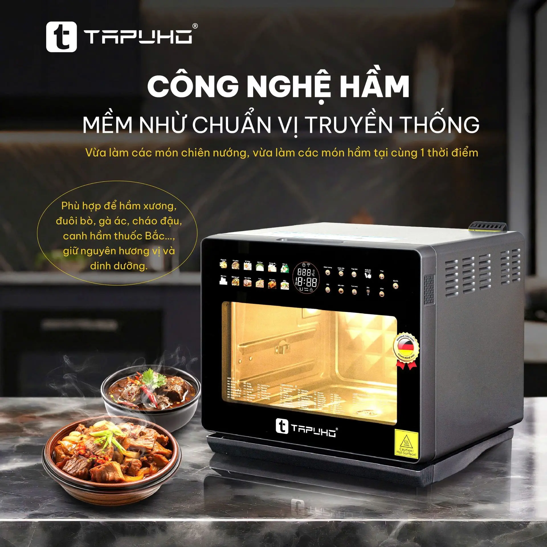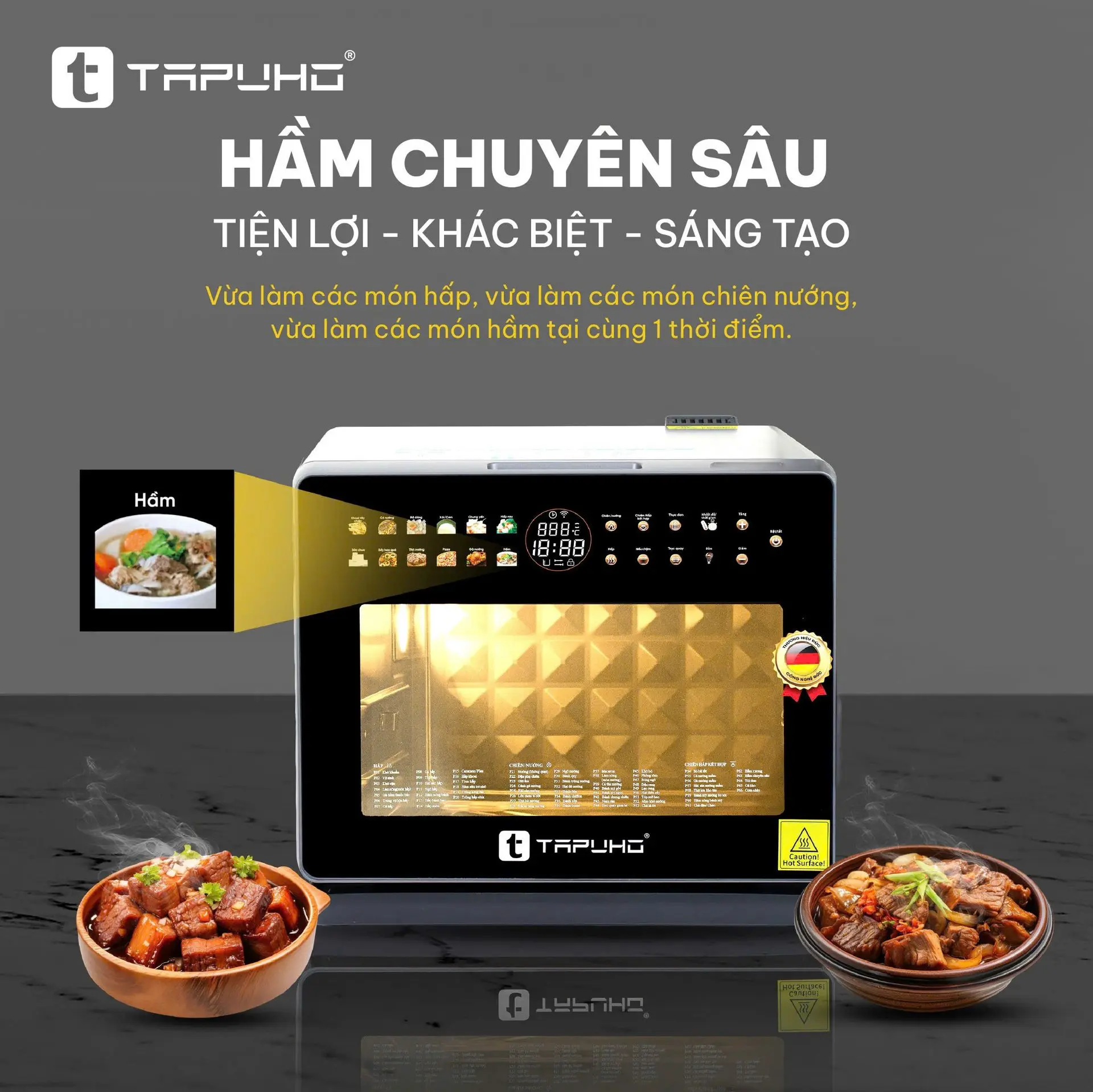 Thì ở TAPUHO TSF16 COLOR, TAPUHO cho ra chức năng “HẦM CHUYÊN SÂU” với cơ chế hoạt động độc đáo hơn, giúp người dùng có thể vừa làm các món hấp, vừa làm các món nướng, vừa làm các món hầm tại cùng một thời điểm!