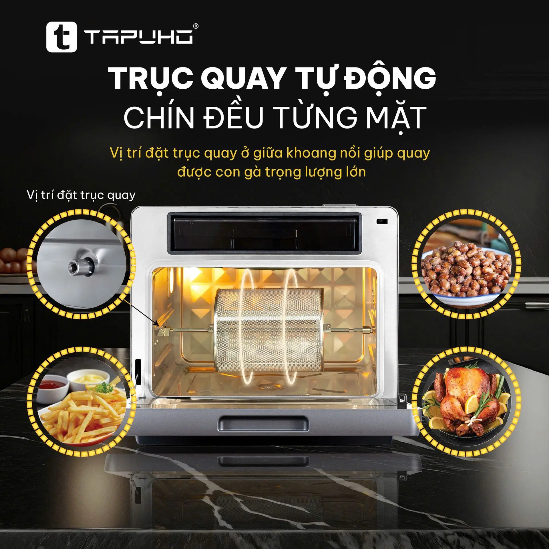Hệ thống trục quay tự động xoay 360°, giúp món gà, vịt, khoai tây… chín đều và vàng giòn mà không cần lật.
