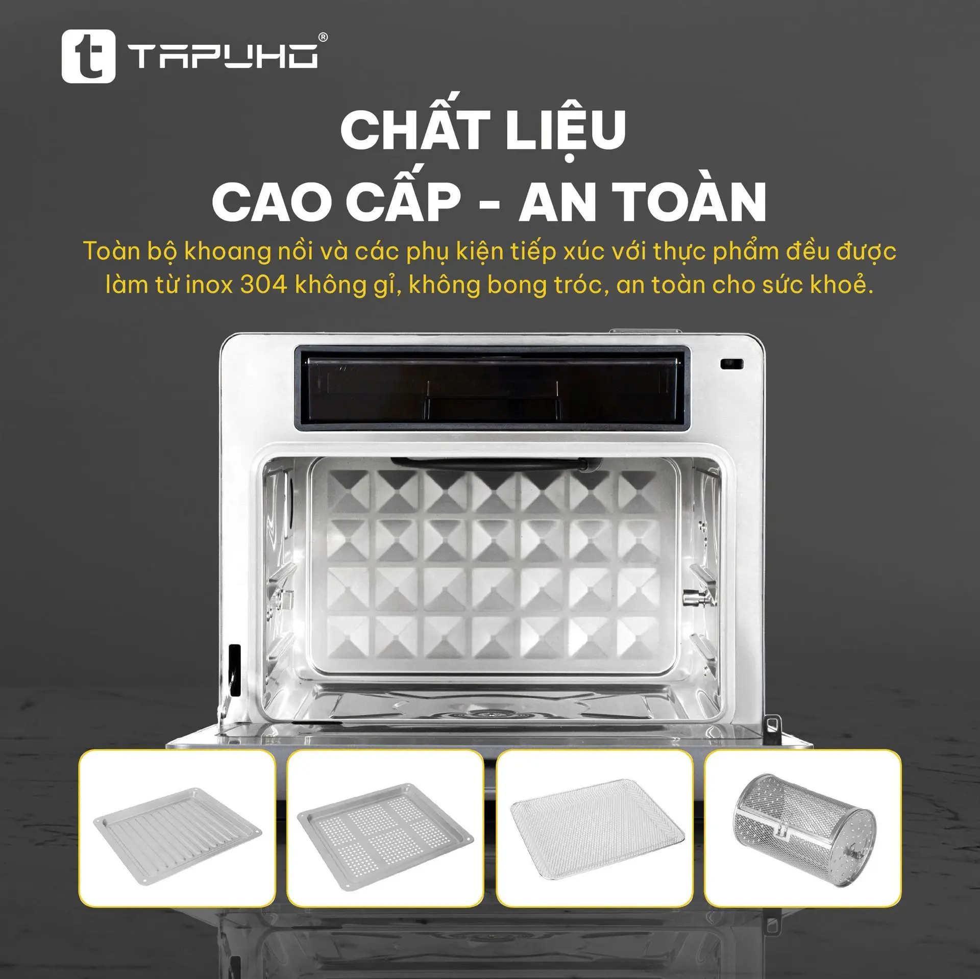 Khi mua TAPUHO TMC20 PrimeAI, người dùng nhận ngay bộ phụ kiện inox 304 cao cấp gồm: khay hấp, khay nướng, rá chiên, trục quay, giỏ quay, nhông quay, dây buộc gà, dụng cụ lấy khay, găng tay chống nóng, cùng sách công thức nấu ăn.