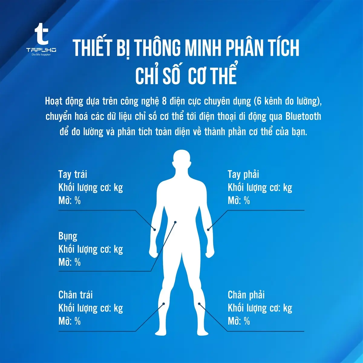 Thiết bị thông minh phân tích chỉ số cơ thể TAPUHO TBS180 hoạt động dựa trên công nghệ 8 điện cực chuyên dụng (6 kênh đo lường), chuyển hoá các dữ liệu chỉ số cơ thể tới điện thoại di động qua Bluetooth để đo lường và phân tích toàn diện về thành phần cơ thể của bạn. Sản phẩm này có thể phân tích được các chỉ số cơ thể như: