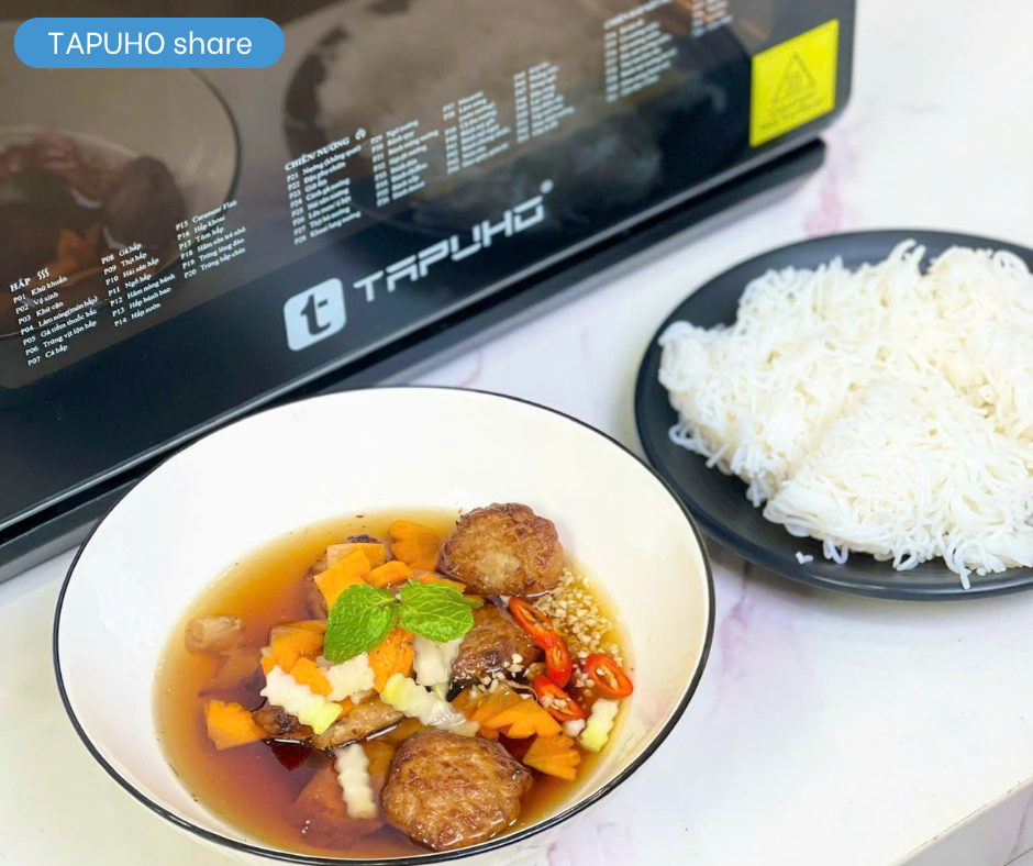 Bún chả truyền thống thường được nướng trên bếp than để tạo mùi thơm đặc trưng và lớp thịt cháy xém hấp dẫn. Tuy nhiên, với sự phát triển của các thiết bị bếp hiện đại, việc chế biến món ăn này tại nhà đã trở nên đơn giản và tiện lợi hơn. Máy nấu ăn đa năng TAPUHO TMC20 PRIMEAI được thiết kế với nhiều chế độ nấu linh hoạt và khả năng gia nhiệt mạnh mẽ, cho phép tái tạo hiệu ứng nướng vàng thơm tương tự bếp than nhưng sạch sẽ và dễ kiểm soát hơn. Chính nhờ những đặc điểm này mà người dùng hoàn toàn có thể làm bún chả chuẩn vị Hà Nội ngay tại nhà chỉ với một thiết bị duy nhất. Dưới đây là những lý do giúp TAPUHO TMC20 PRIMEAI thực hiện tốt món ăn này.