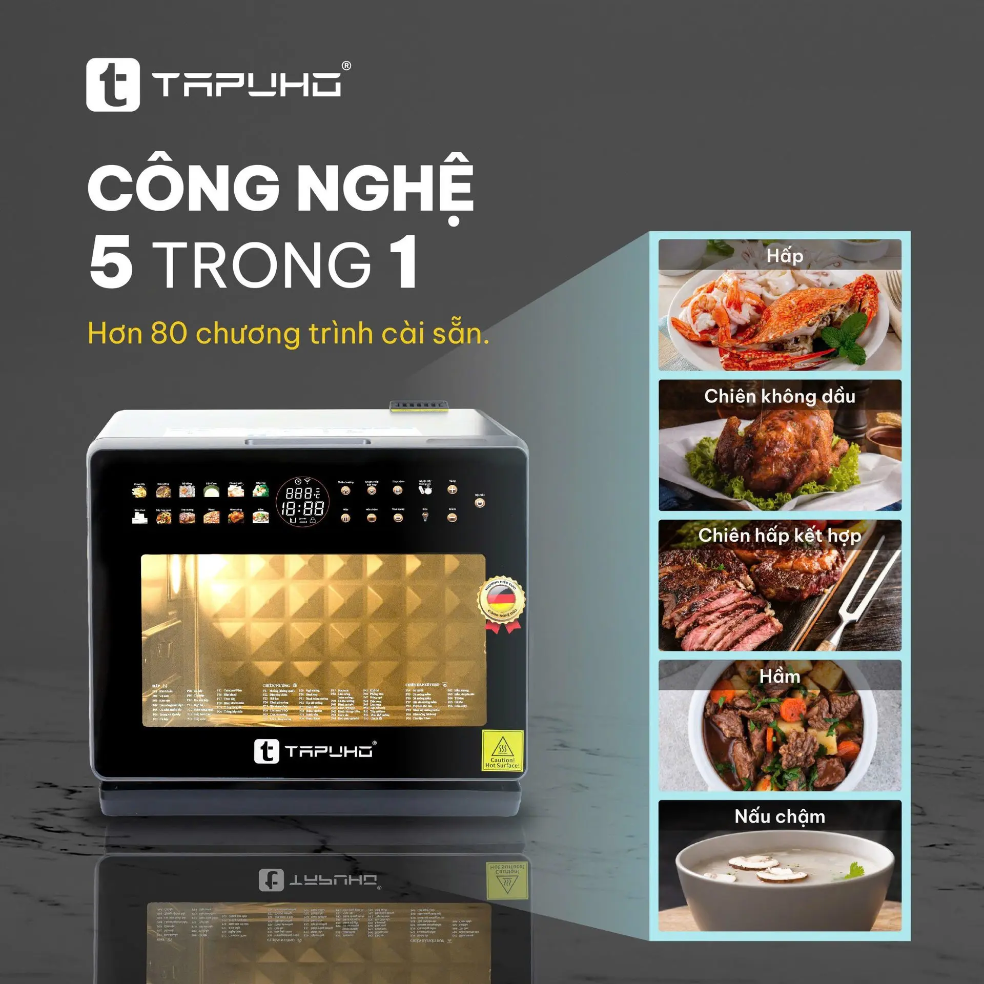 Máy nấu ăn đa năng TAPUHO tích hợp nhiều chế độ nấu (chiên - nướng - hấp - hầm - nấu chậm) trong một thiết bị. Người dùng có thể dễ dàng thực hiện các bước như hấp chín nguyên liệu, hầm mềm thịt hay hấp pate mà không cần chuyển sang nhiều dụng cụ bếp khác nhau, giúp quy trình nấu ăn gọn gàng và tiện lợi hơn.