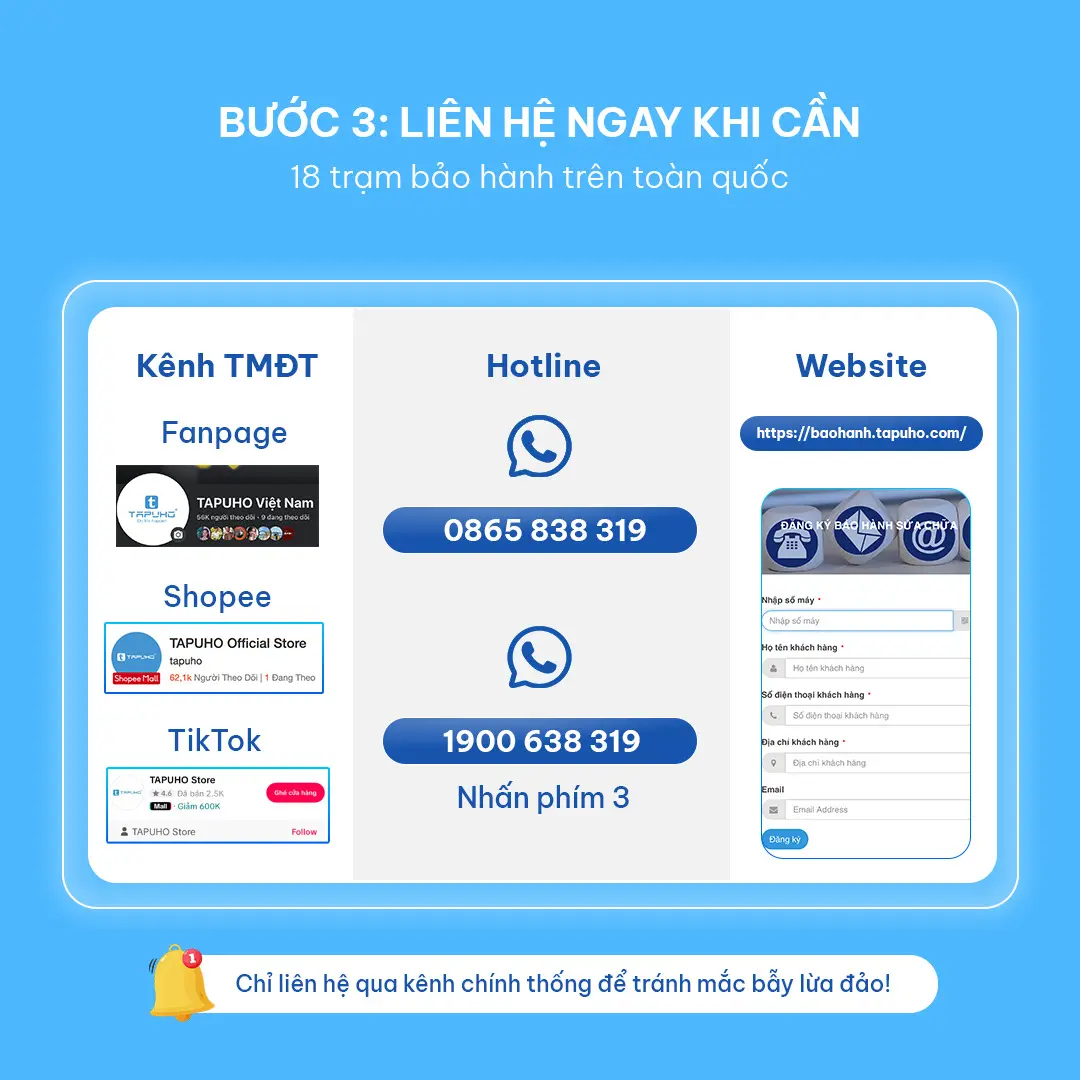 Bước 3: Trong quá trình sử dụng, nếu có bất kỳ vấn đề nào cần hỗ trợ, khách hàng có thể liên hệ qua các kênh chính thống của thương hiệu TAPUHO để được phản hồi một cách nhanh chóng nhất:
